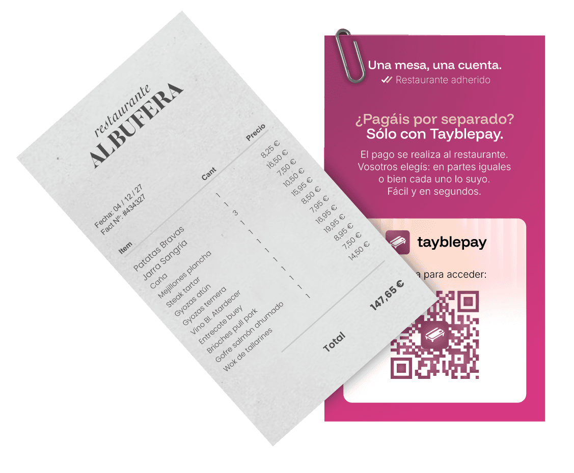 No digas no a dividir la cuenta. Tan sólo deja un simple QR junto a la cuenta y deja que la magia fluya. Sin mover un dedo.
