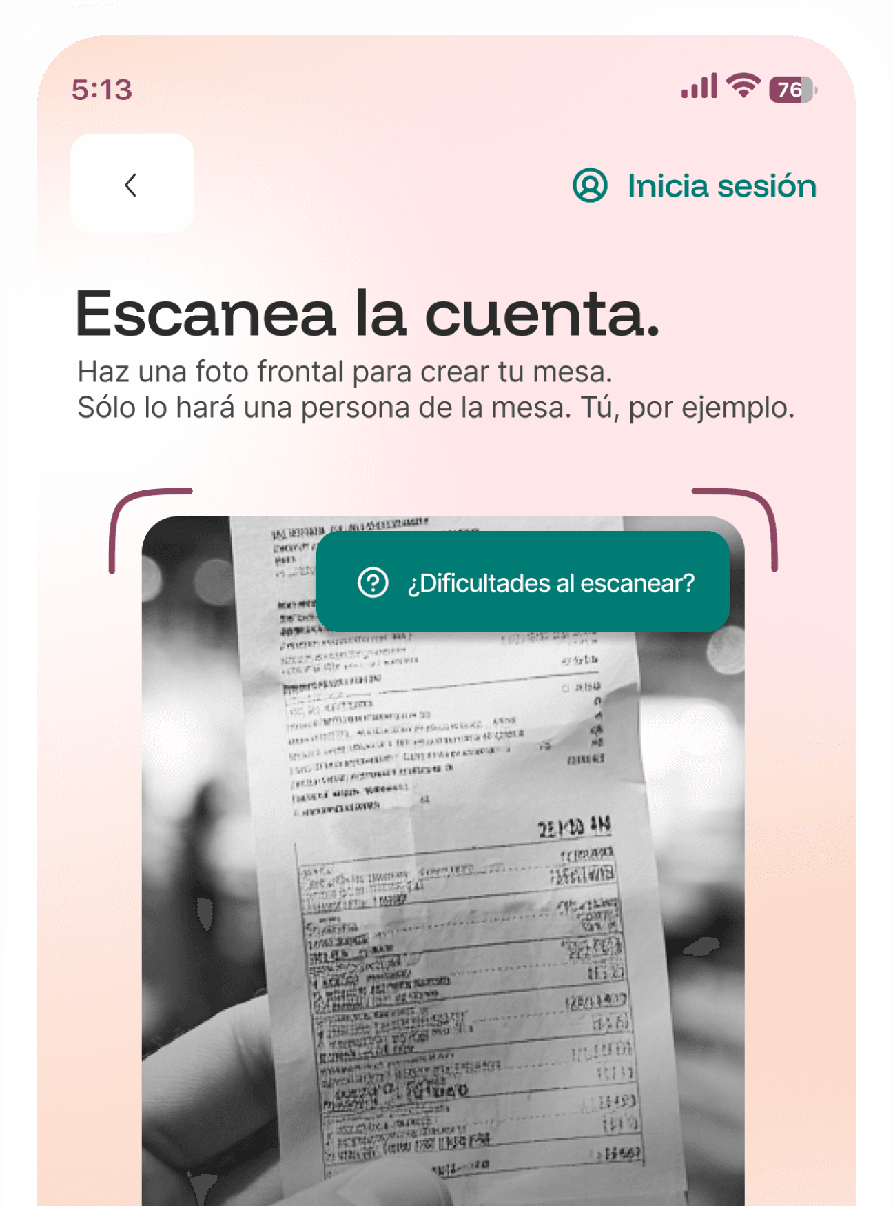 Uno de los comensales escanea la cuenta para crear la mesa. Usando la tecnología de reconocimiento de caracteres transformamos la cuenta en una mesa digital.