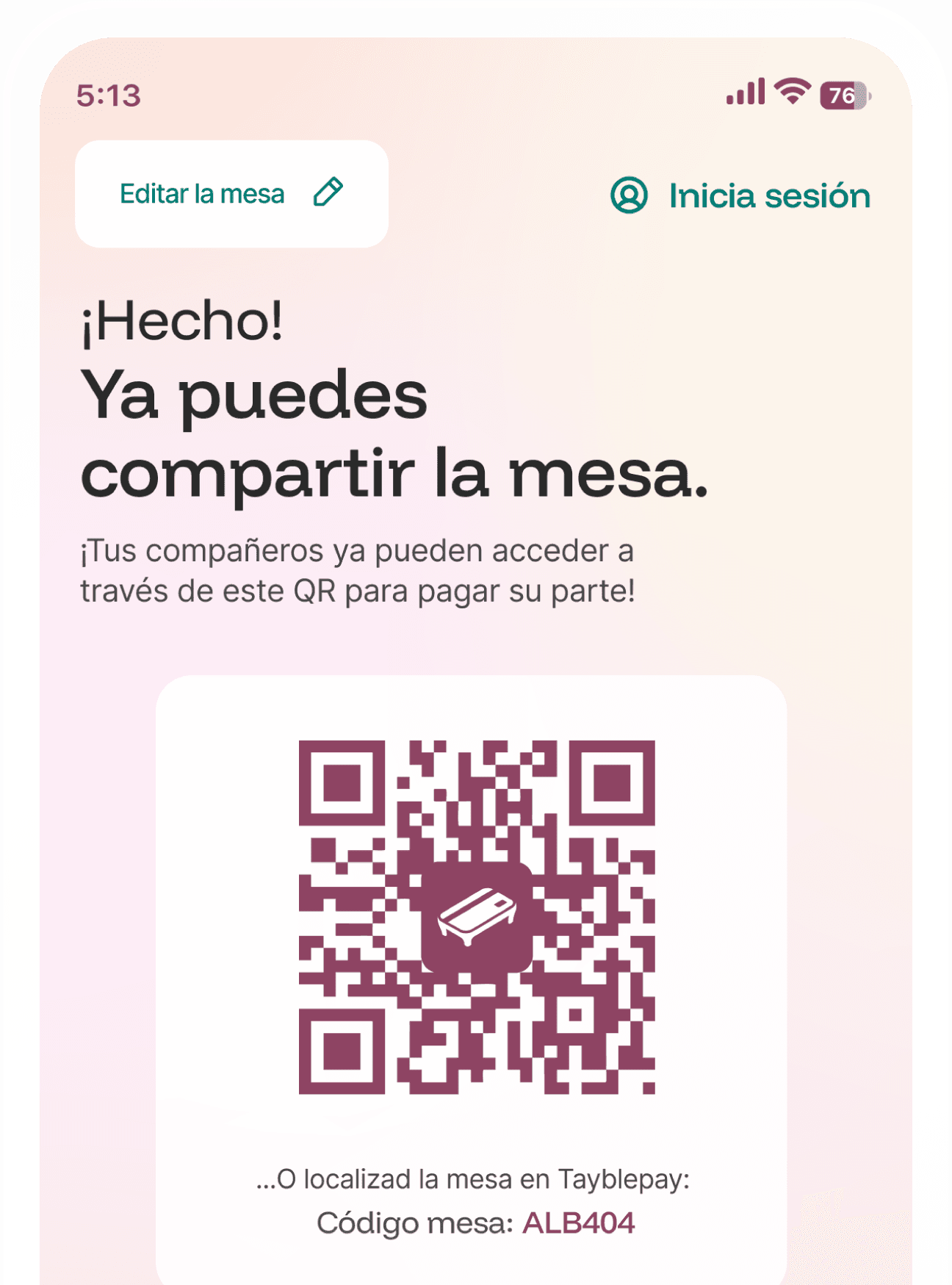 Una vez creada, compartes la mesa con los amigos para que el resto de comensales pueda entrar y pagar su parte.